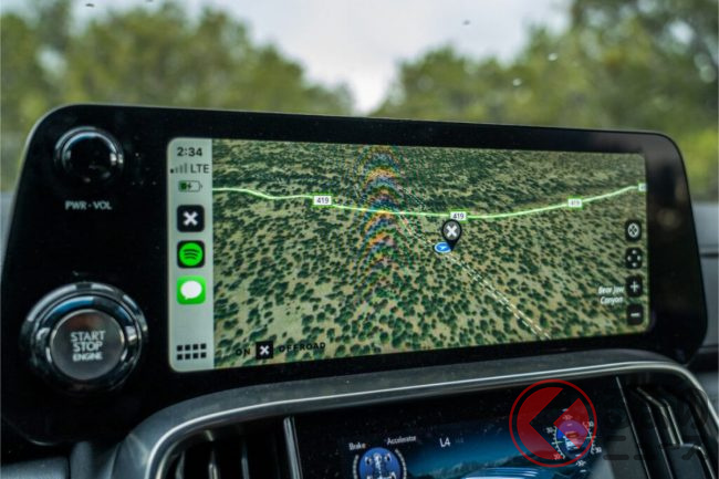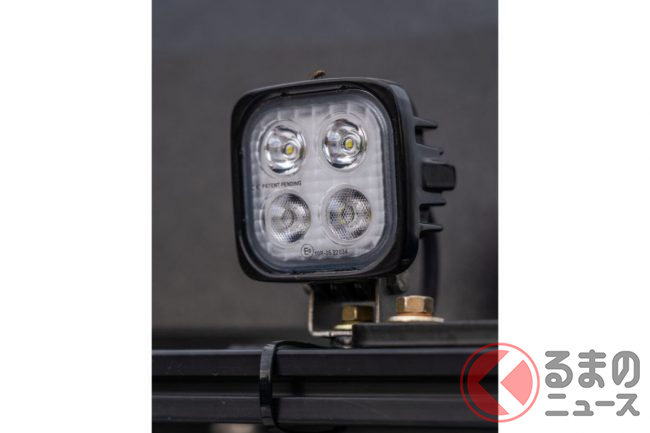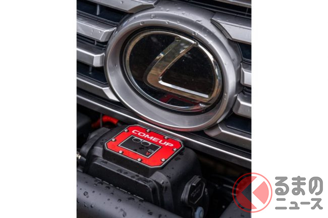 フロント周りはグリルガード一体式フロントバンパーと丸型補助ライトを装着したことで、レクサスを象徴するスピンドルグリルが8割方見えなくなり、野性味を増しています。