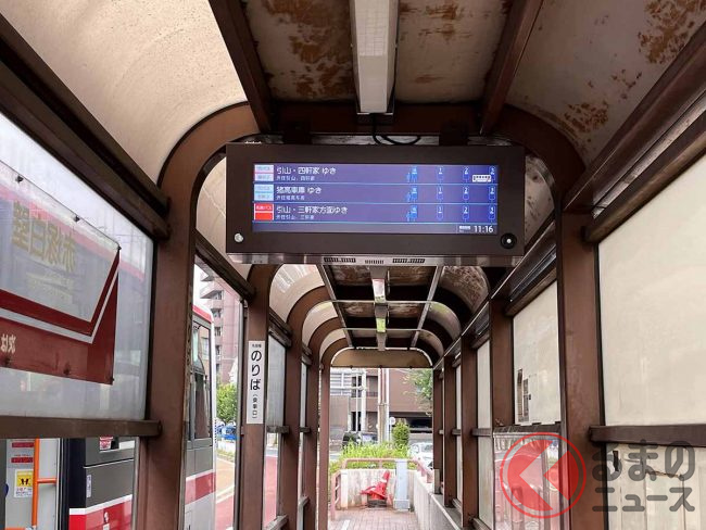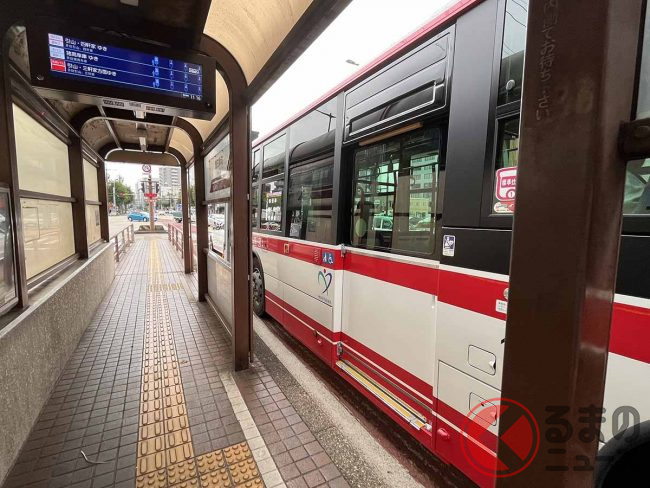 さらに停留所も「相対停留所方式」という珍しい仕様です。これは道路中央に設けられた停留所で乗り降りするというもの。そのため、利用者は横断歩道を渡ってからバスに乗車します。