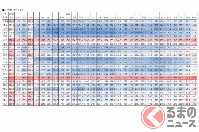 一方、最も高かったのは長野県で181.2円、次いで長崎県178.9円、鹿児島県178.4円でした。