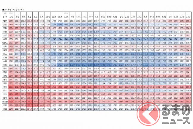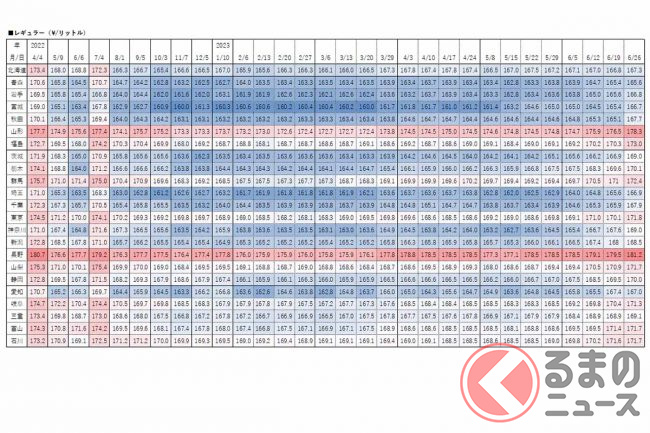 経済産業省資源エネルギー庁は2023年6月28日、レギュラーガソリンの26日時点の店頭小売価格(消費税込)を発表しました。