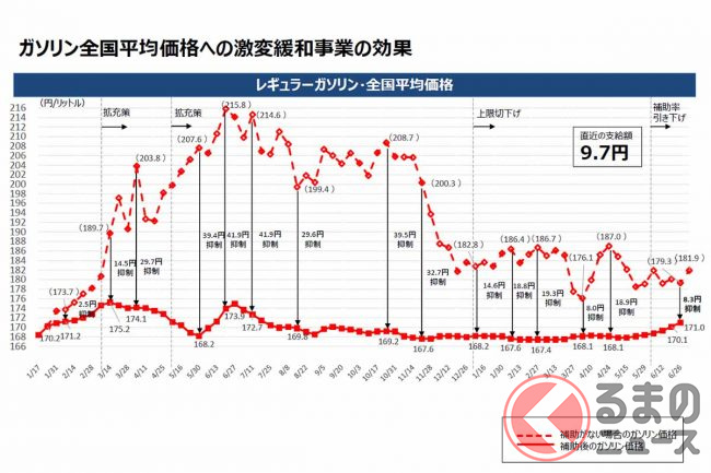経産省によると、補助金がない場合のレギュラーガソリンの全国平均小売価格は、7月3日時点で181.9円になると見ています。