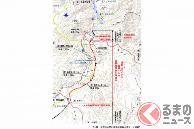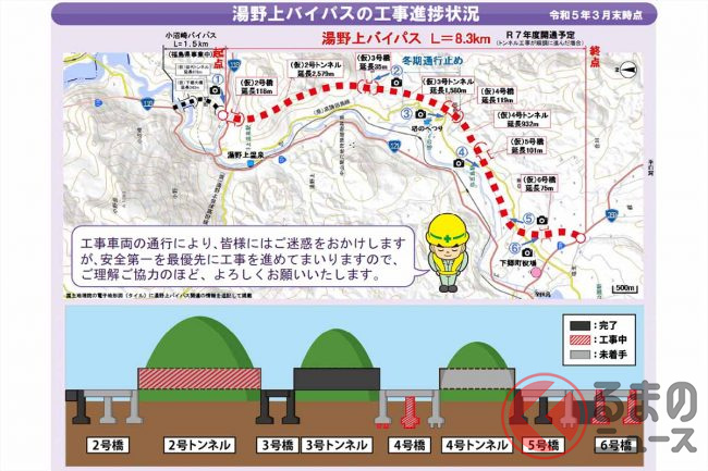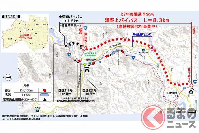 国道121号湯野上バイパスは、福島県下郷町で事業が進む延長8.3kmの自動車専用道路です。国道121号(現道)は阿賀川の西側を走りますが、湯野上バイパスは東側を通ります。