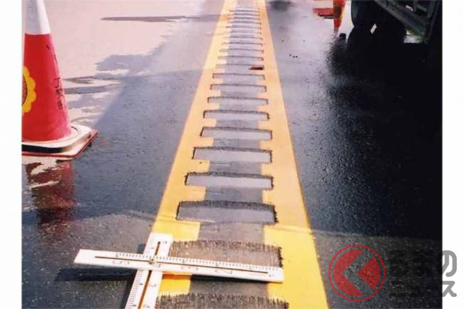 ランブルストリップスは、舗装された路面を削って作る連続した凹型の溝です。これを踏んだクルマに不快な音や振動を発生させ、車線からはみ出ていることを知らせます。