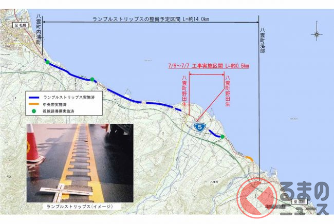 北海道八雲町の国道5号で発生した交通事故の現場で、安全対策として「ランブルストリップス」の工事が実施されます。具体的にどのような対策なのでしょうか。