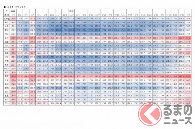 一方、最も高かったのは長野県で182.2円、次いで山形県180.3円、長崎県179.9円でした。
