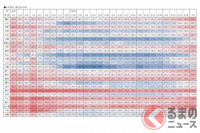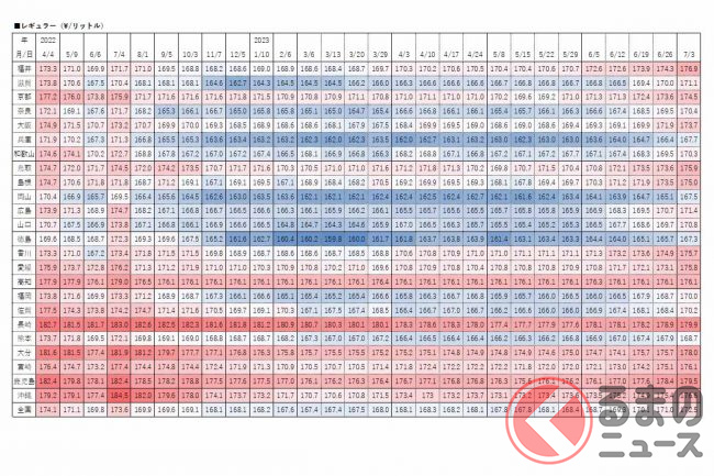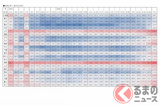 経済産業省資源エネルギー庁は2023年7月5日、レギュラーガソリンの3日時点の店頭小売価格(消費税込)を発表しました。