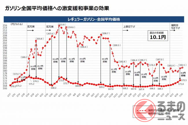 経産省によると、補助金がない場合のレギュラーガソリンの全国平均小売価格は、7月10日時点で182.5円になると見ています。