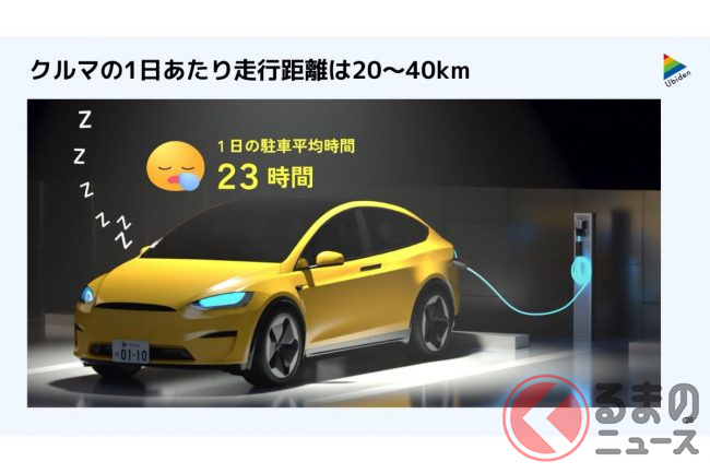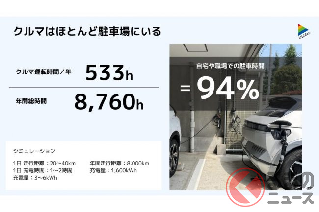 よく耳にするEV普及の課題として「充電時間が長い」「航続距離が短い」「(急速充電ステーション等を含む)充電場所が少ない」などがありますが、これらについて、ユビ電はシミュレーションを行い、クルマを運転する時間が年間の総時間に対してわずか6%で、逆に残りの94%は自宅や職場での駐車時間であり、1日あたりの走行距離も平均20~40kmにとどまると分析。