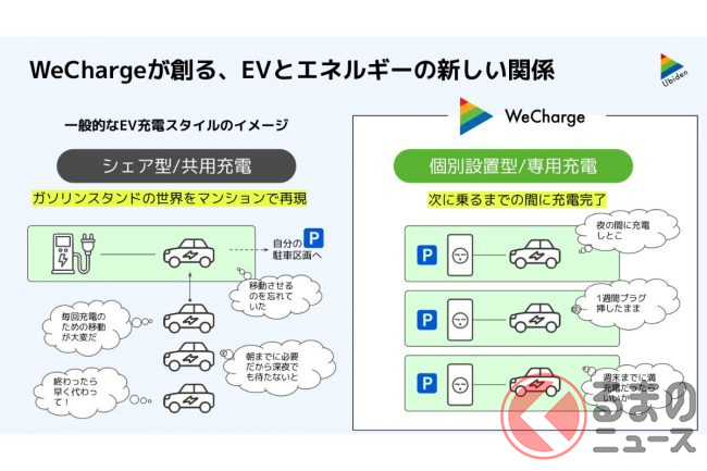 ユビ電は、「WeCharge」を新築マンションなどの建設時に導入するのはもちろんのこと、既存のマンションなどの集合住宅で充電設備のない駐車場に導入することも支援。