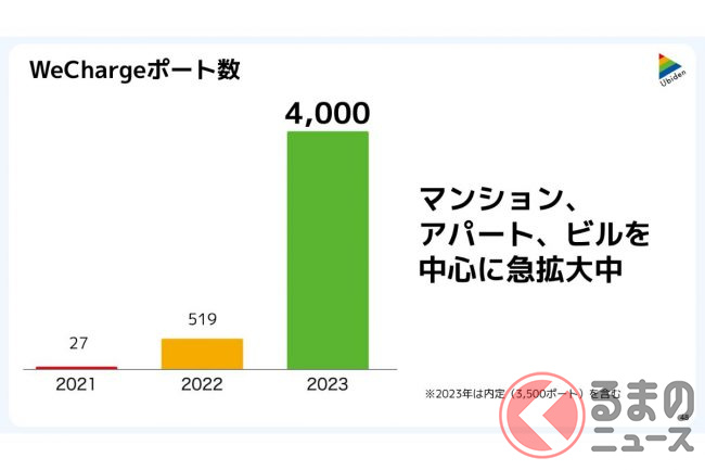 2023年中には現時点での内定を含め約4000もの「WeCharge」ポートが新たに設置される予定で、そのうちの約半数が新築マンションなどでの整備、残り半分が既存の施設や集合住宅などの駐車場での整備とのことです。