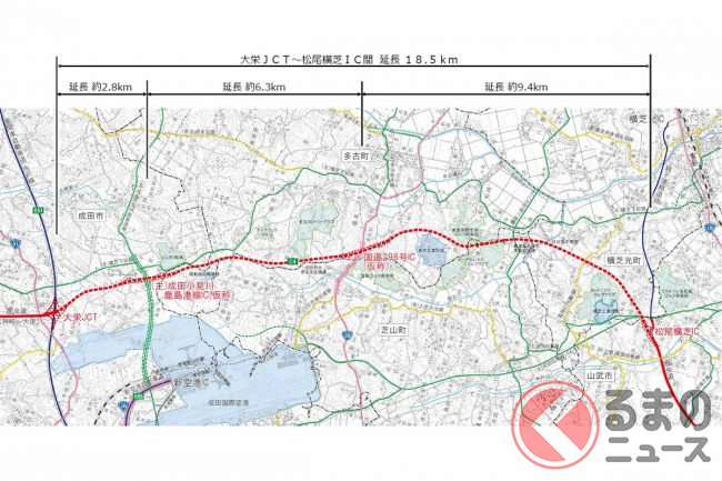 千葉県では現在、東関東道と接続する大栄JCT(成田市)から、銚子連絡道と接続する松尾横芝IC(山武市)までを結ぶ延長18.5kmの道路建設が進んでいます。