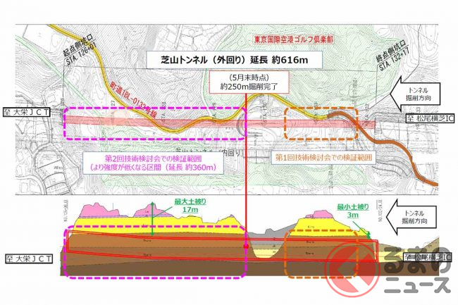 トンネル掘削は、芝山トンネル(延長616m、芝山町・多古町)で難航しています。ここは砂質土で形成された地質構造で、砂時計の砂が流れ落ちるような流砂現象を引き起こす可能性があるといいます。