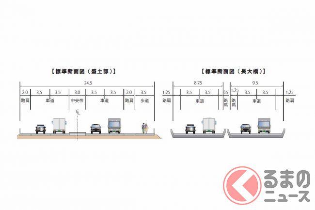 なお、同じく暫定2車線となっている梅田ICから金沢森本ICまでの2.1kmも4車線化事業に着手されていますが、2023年度は埋蔵文化財調査や橋梁下部工事などが推進されます。