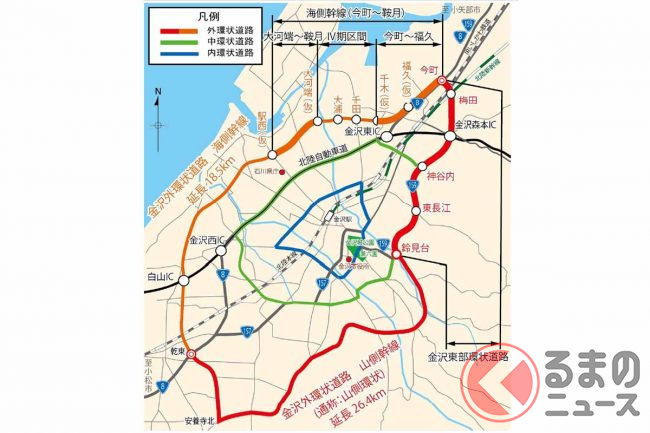 金沢市周辺では街の渋滞緩和を図るため、市中心部を囲むように走る環状道路の整備が進められています。