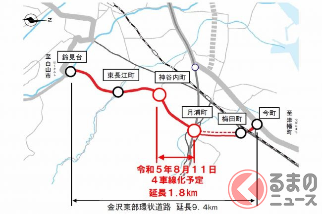 国土交通省北陸地方整備局金沢河川国道事務所は2023年7月5日、国道159号「金沢東部環状道路」(山側環状)の金沢森本IC~神谷内IC間を、8月11日に4車線化すると発表しました。