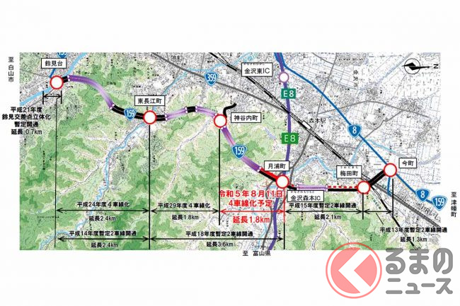 国道159号「金沢東部環状道路」の4車線区間がさらに延伸。北陸道から金沢市街への渋滞緩和が期待されます。
