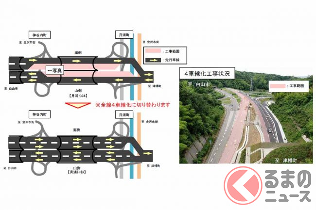 そのため現在、4車線化工事が進められており、8月11日に、金沢森本IC(北陸道)から月浦トンネルを経て神谷内ICに至る1.8kmが4車線化する予定です。