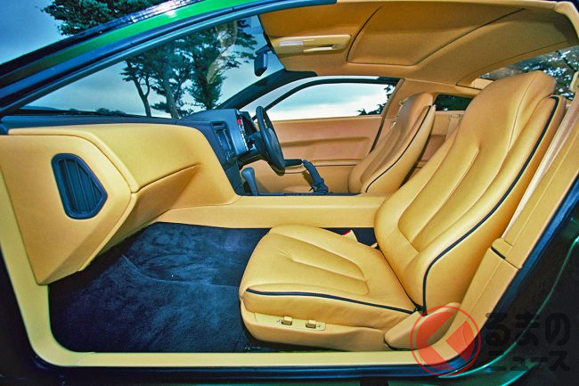 インパネにはナビゲーションシステムが搭載されているほか、メーター左右を覆うように設けられたエアコンスイッチやオーディオコントロールスイッチは「スカイライン(R32型)」との共通性を感じさせます。