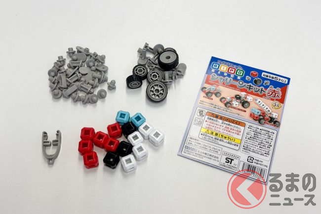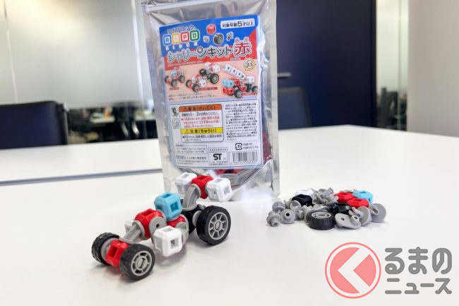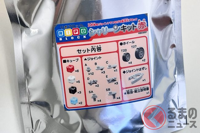 「リポブロック シャリーンキット赤」には、16個の立方体パーツと各種ジョイントパーツが29個、大小のホイールが6個、さらにジョイントはずしと取扱説明書、組み立て説明書が付属しており、ミユキ精工のオンラインショップ「ミユキプラス」では、990円(税込み)で販売されています。