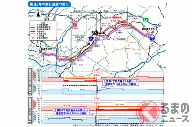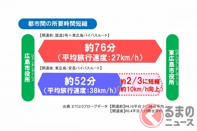 バイパス全通により平均旅行速度は約10km/h向上し、広島~東広島の両市役所間の所要時間は従来の3分の2に相当する約52分に短縮されるなど、円滑な交通が確保されているといいます。
