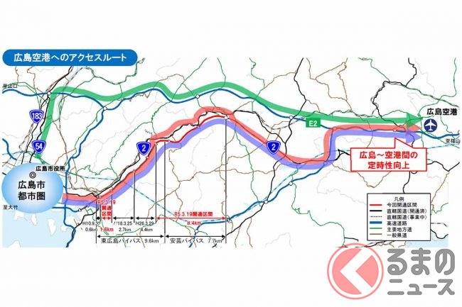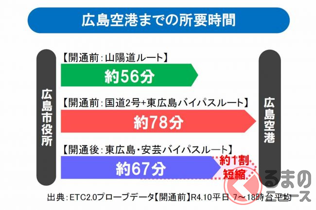 広島国道事務所によると、広島市役所~広島空港の所要時間は、従来の山陽道経由が約56分で最速なのは変わりませんが、国道2号経由は約78分からバイパス全通後約67分に短縮。さらに所要時間のばらつきが軽減し、定時性が向上したということです。