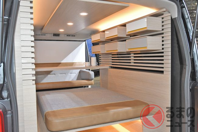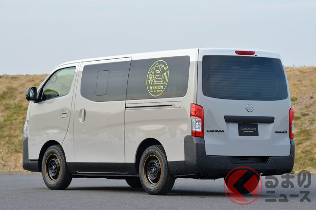4ナンバー枠の限られたサイズのなかで広大な荷室を有する商用ワンボックスバンのキャラバンをベースに、その空間を「部屋」として活用したモデルです。