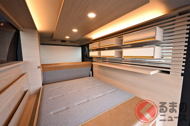 木目を基調とした室内には、壁に作り付けのモダンな棚やテーブルが備わり、天井の間接照明が落ち着いた雰囲気を高めるなど、徹底的に「クルマ」感を排除したオシャレな空間へとトータルコーディネイトされています。