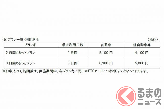 価格は、「2日間」の普通車が5100円、軽自動車等が4100円、「3日間」の普通車が6900円、軽自動車等が5800円です。