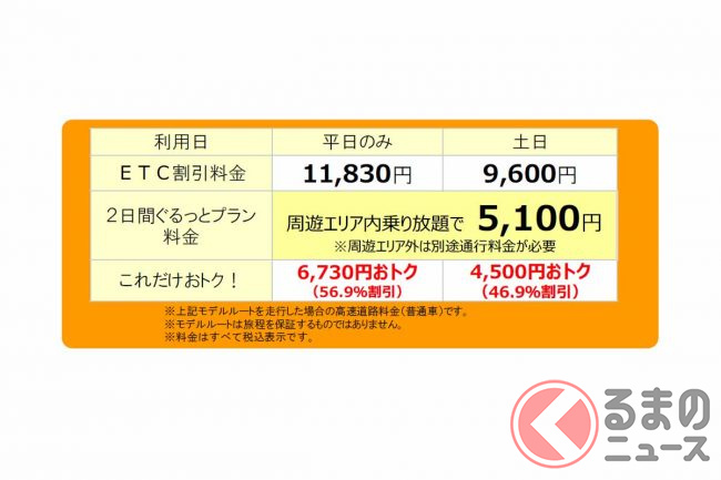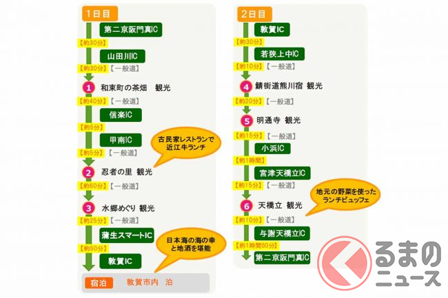 モデルプランとして普通車で2日かけて、和束町(京都府)の茶畑や忍者の里(滋賀県甲賀市)、鯖街道熊川宿(福井県若狭町)、天橋立(京都府宮津市)などを巡る場合、ETC料金だと平日1万1830円、土休日9600円ですが、「2日間ぐるっとプラン」だと57~47%安い5100円になります。