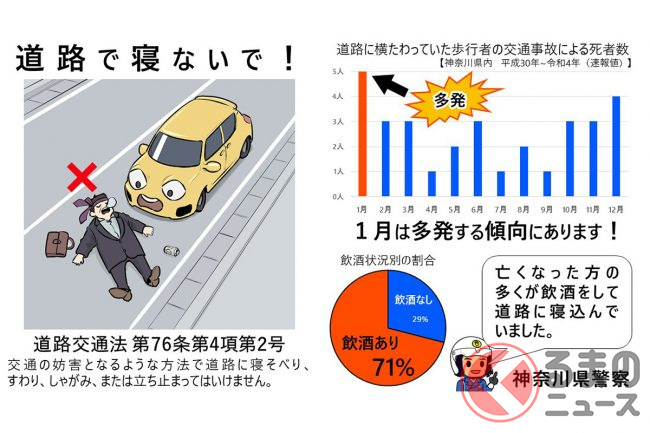 神奈川県警察本部交通部交通総務課のSNSでは定期的に「お酒に酔って道路で寝る人」に対する注意喚起を行っています。意外な注意喚起にはどのような背景があるのでしょうか。