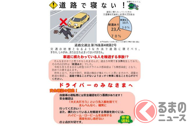 これにより、道路上に横たわっていて事故に遭い亡くなった人のうち約70%が飲酒していたと明らかになっています。