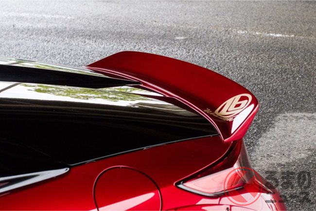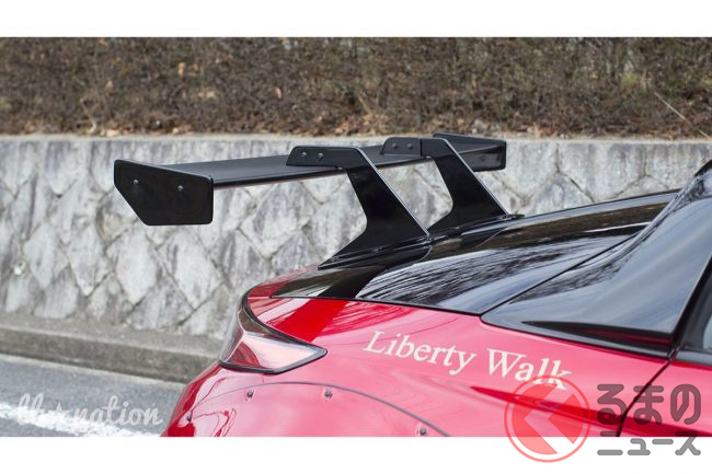 リアも同様にバンパーが換装され新たなデザインのものとなってるほか、リバティーウォークオリジナルの排気マフラーとリアウィングを装備され、レーシングカーのようなデザインです。