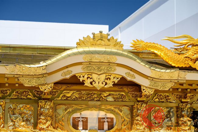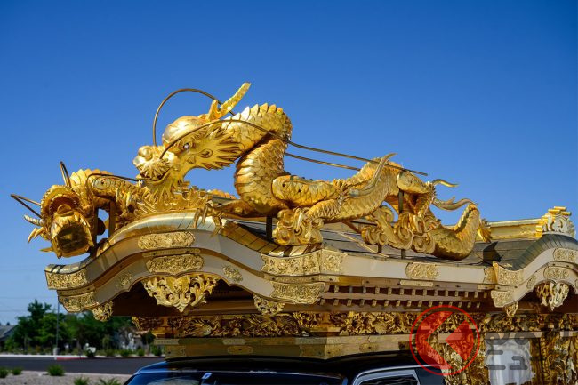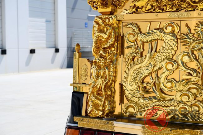 全体に金色でまばゆい装飾にあしらわれたセンチュリー 宮型霊きゅう車。伝統的な唐破風(からはふ)の屋根の上には見事な金の龍が装飾されるなど、息をのむ仕上がりです。