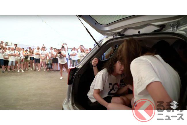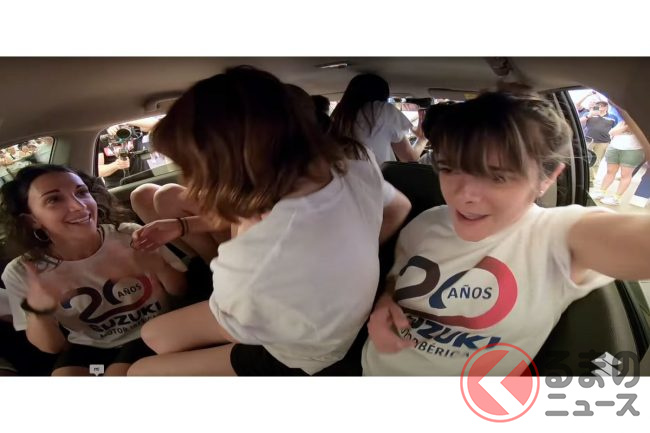 スズキのクルマに“美女”が「すし詰め」!? 全長4.2m以下の「コンパクトSUV」は“20人以上”乗車可能! 西法人が異様なチャレンジを実施