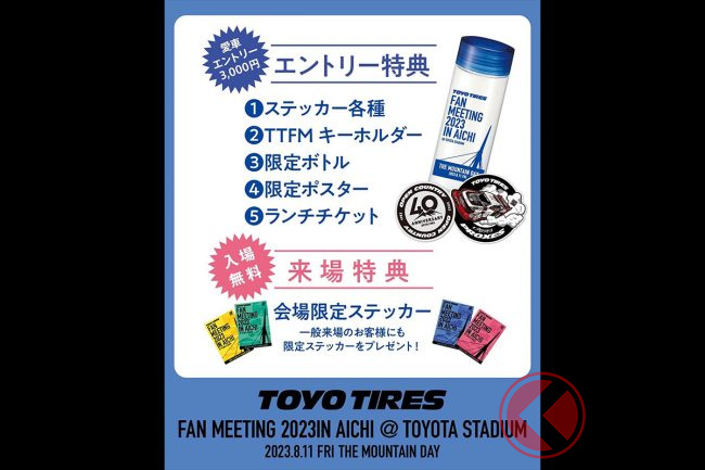 トーヨータイヤは今年2回目となるファンミーティング「TOYO TIRES FAN MEETING 2023 in AICHI」を8月11日に豊田スタジアム(愛知県豊田市)で開催すると発表しました。