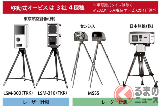 現在、移動式オービスは3社4種類の機器が存在し、都道府県警ごとに導入機種が分かれています。