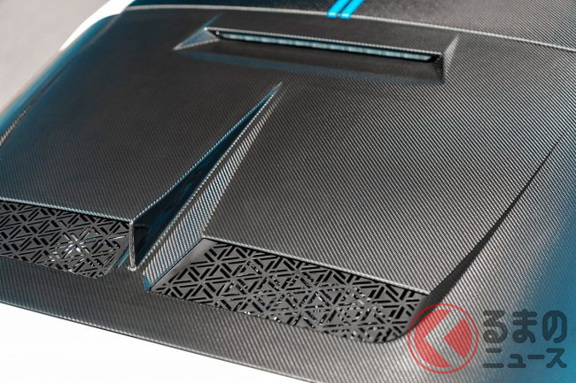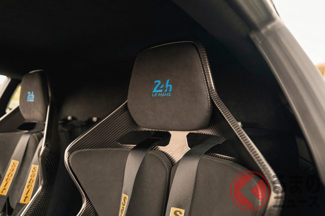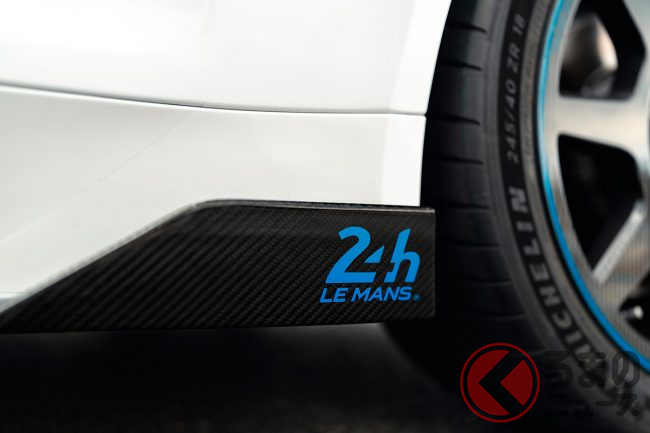 ボンネットやルーフ、リアフード、スポイラーには「24H LE MANS」のロゴ入りブルーストライプを施し、専用デザインとなったリアフードにはシャークフィンが取り付けられ、18インチカーボンホイールも専用品を装着。