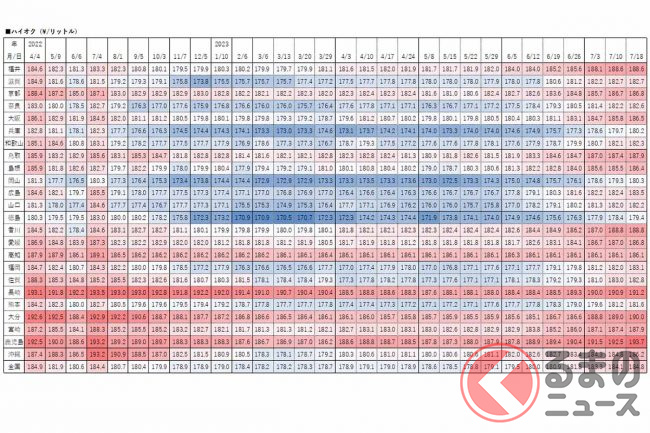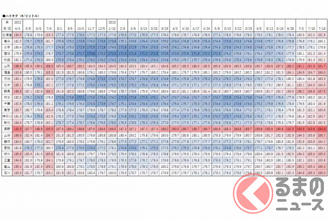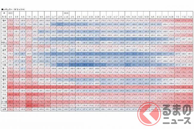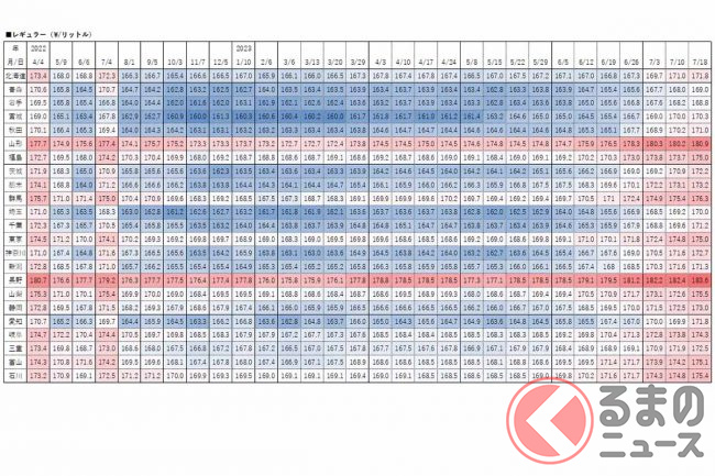 経済産業省資源エネルギー庁は2023年7月20日、レギュラーガソリンの18日時点の店頭小売価格(消費税込)を発表しました。