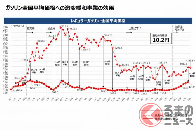 経産省によると、補助金がない場合のレギュラーガソリンの全国平均小売価格は、7月24日時点で185.1円になると見ています。