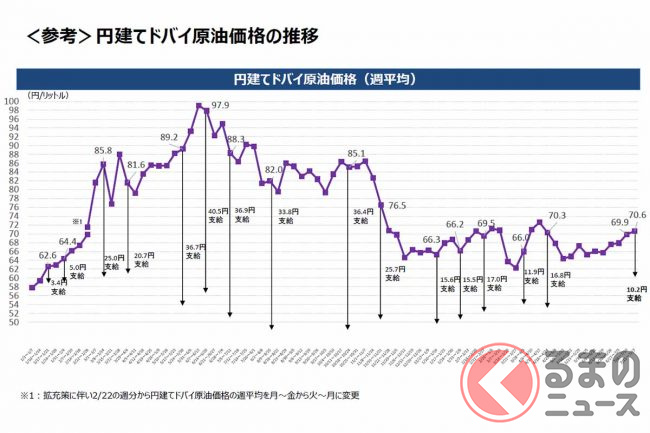 このような状況を踏まえ、補助金の支給単価は10.4円でしたが、20日から10.2円に減額されています。