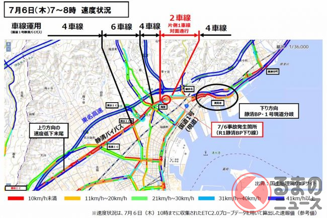 国土交通省中部地方整備局静岡国道事務所は2023年7月20日、国道1号静清バイパスの橋桁落下事故の現場で実施している対面通行規制は、8月半ば頃に解除できる見込みと発表しました。