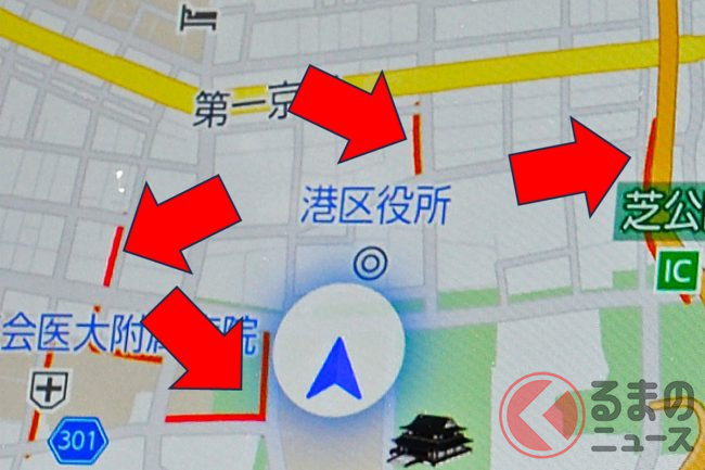 車のナビに表示「道路に沿ったナゾのカラフル線」の意味は何? 近年は「命に関わる」大事な情報も表示! 実はめちゃめちゃ便利な表示とは