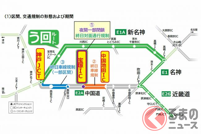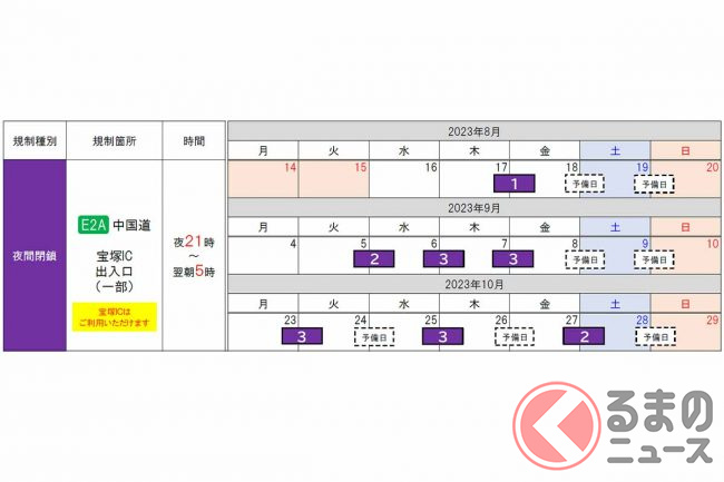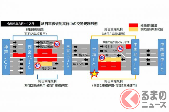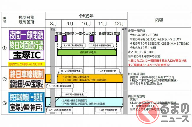 宝塚ICは、8月18日から12月中旬まで終日対面通行規制が実施されます。一部の出入口では断続的に夜間閉鎖も行われます。
