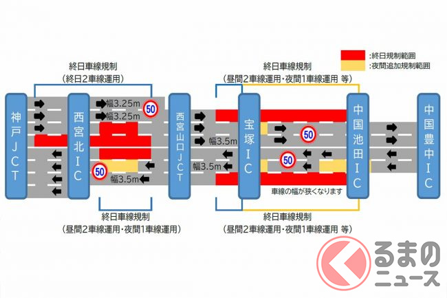 中国道「お盆後」も車線規制と速度制限あり 宝塚ICは夜間閉鎖も計画