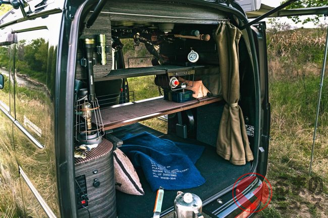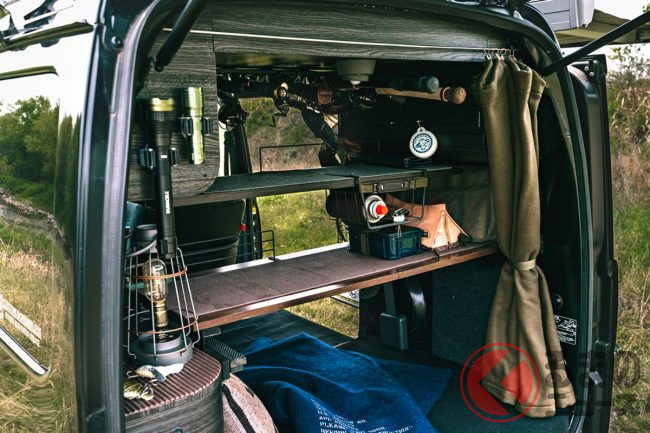 ほかにも、室内の遮光性と保温性の向上させるカーテンを採用し、タッセルには「CUSTOM BORDERLESS」のレザータグを使用。キャンプ道具を簡単便利に保持できるマルチツールキャッチャーは、作業中に手が届きやすい箇所に2つ設置しました。