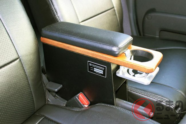 手触りの質感にこだわったセンターコンソールは、天然木と高級感のあるフェイクレザーを使用したほか、ドリンクホルダーにはアルミの「CUSTOM BORDERLESS」ロゴデザインプレートを装飾。