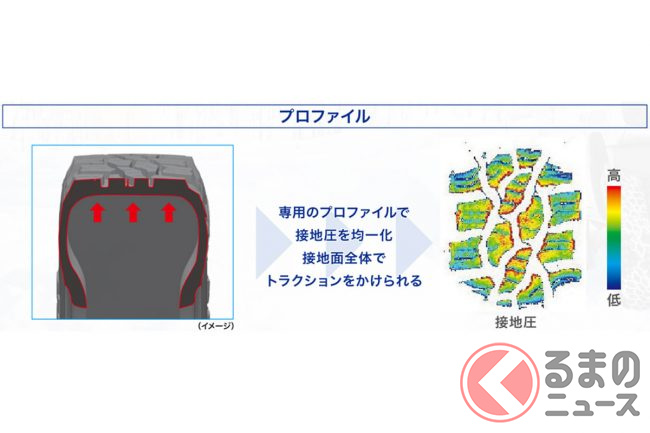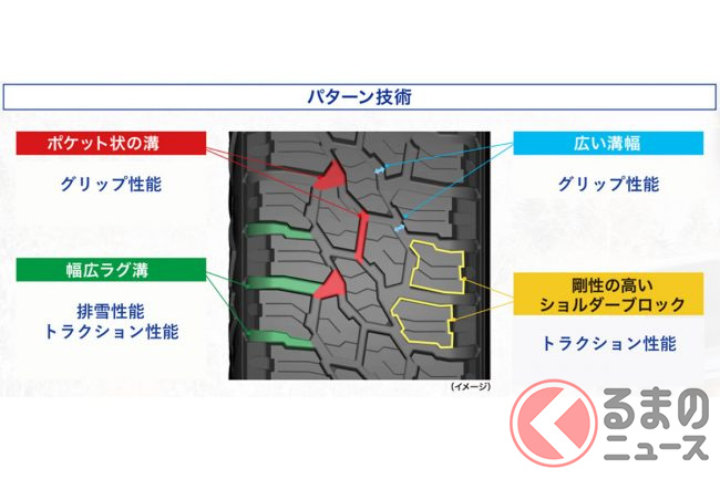 オフロードライクなブロック形状の専用トレッドパターンは、ポケット状の広い空間の溝を配列することによって雪をつかみながら優れたグリップ性能を発揮し、剛性の高いショルダーブロックは高いトラクション性能に寄与。さらに、専用のプロファイル(タイヤの断面)によってタイヤと地面の接地圧を均一化させることもトラクション性能を向上させ、深雪でも走り切れる能力を持つとのことです。