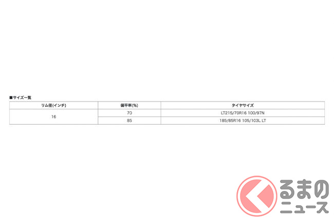 今回発売されるタイヤは16インチサイズのホイールに適合する「LT215/70R16 100/97N」と「185/85R16 105/103L LT」の2サイズ展開で、オープン価格です。