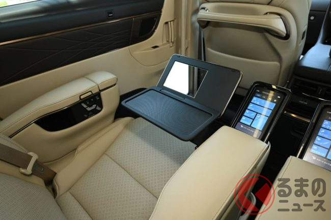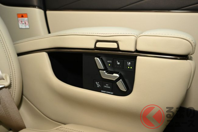 ルーフに備わる機能性・収納性を両立した「スーパーロングオーバーヘッドコンソール」は、これまで天井の各所に点在していたドア&シェード、リアエアコンなどの操作スイッチが集約された他、リアシートのアームレストに備わる「リヤマルチオペレーションパネル」によってオーディオ/照明/シート稼働など車内のさまざまな機能を操作することが可能。