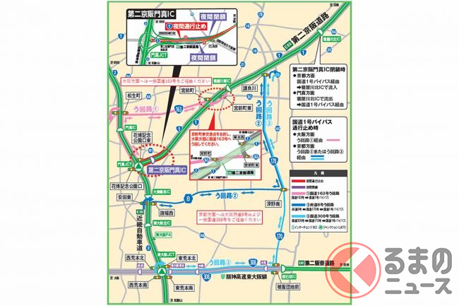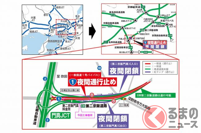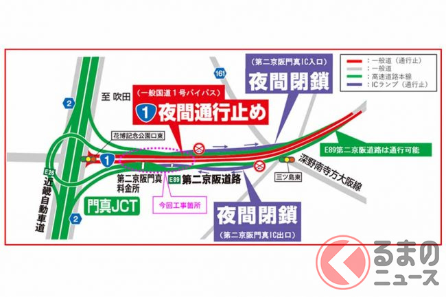 第二京阪門真IC(大阪府門真市)と、並行する国道1号バイパス(大阪北道路)で、2023年の9月から12月にかけて夜間の閉鎖や通行止めが計画されています。